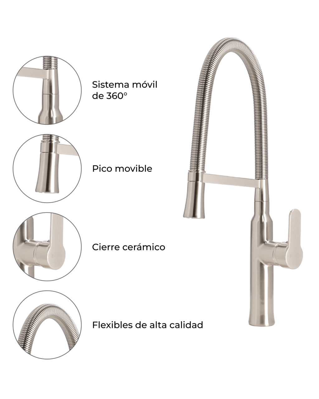 - Pico móvil: Su diseño ergonómico y flexible llega a todos los rincones de tu bacha, permitiendo un control preciso del flujo de agua y facilitando tareas de limpieza, lavado de frutas y verduras, o llenado de recipientes grandes sin esfuerzo adicional.