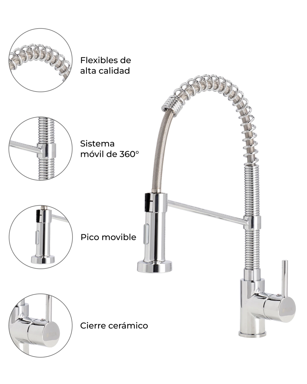 - Pico movible: Ofrece la flexibilidad necesaria para dirigir el flujo de agua donde más lo necesite, optimizando su uso diario.